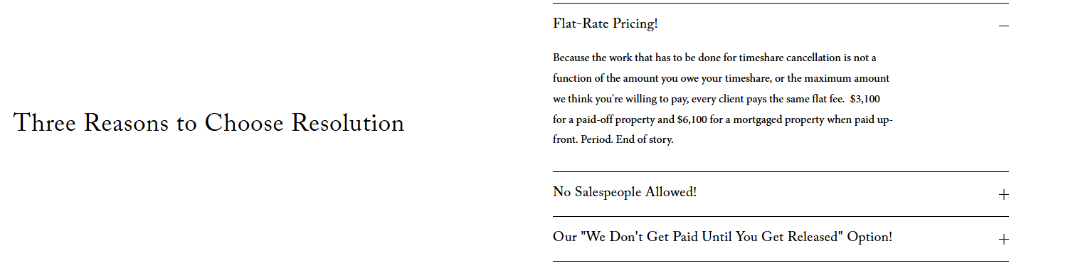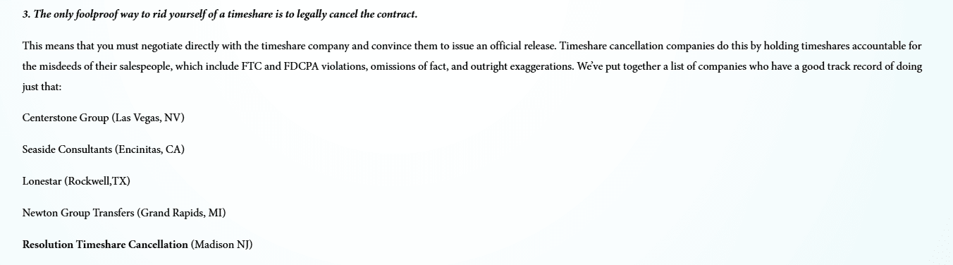 Their FAQ section is another strong point: well-written, detailed, and surprisingly honest. They admit they can’t assist with timeshares from Capital Vacations, Massanutten, or Disney. Even more surprisingly, they acknowledge that some owners can cancel directly through their own resort’s deed-back or exit program — no third-party help needed. It’s rare honesty for this kind of business.