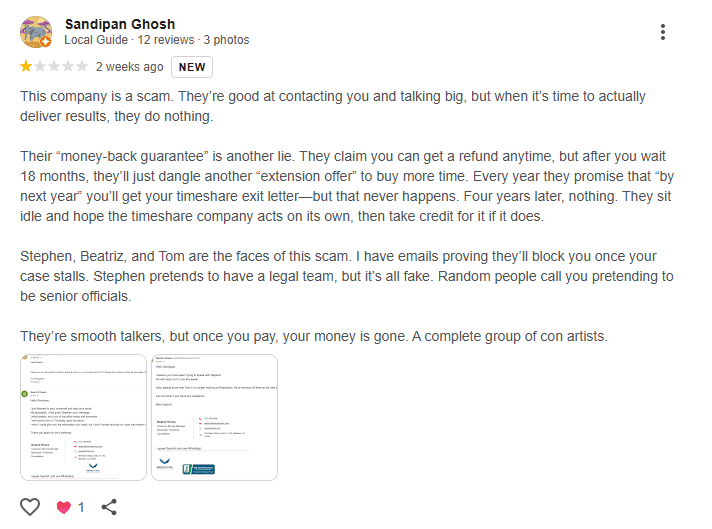 Hopefully, it’s merely a scammer trying to exploit RTC’s name—but the potential for user confusion is alarming. If you do reach out to Resolution Timeshare Cancellation, make absolutely sure you’re using the correct domain—the one without the “1.”