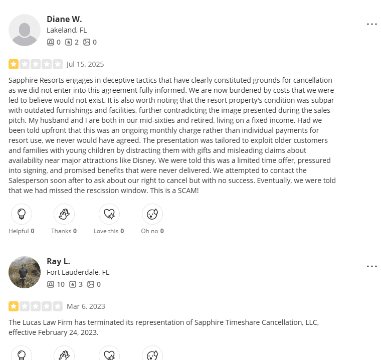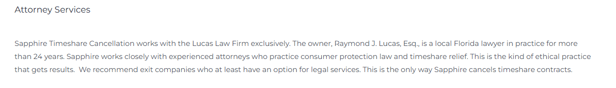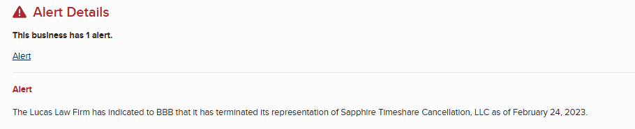 There are also indications that Sapphire Timeshare Cancellation may have worked in conjunction with an entity known as Lucas Law Firm. However, records—such as communications reflected through the Better Business Bureau—suggest that this relationship ended around February 2023, further signaling instability behind the scenes.