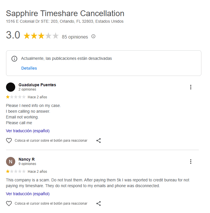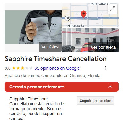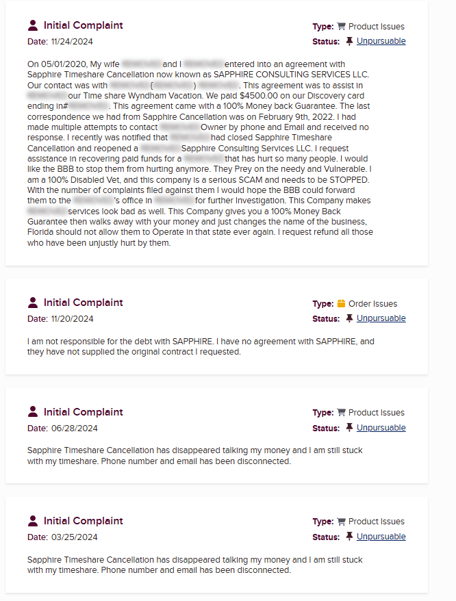 Sapphire Timeshare Cancellation (also known as Sapphire Consulting Services LLC) is a now long-defunct timeshare exit company that we can confidently classify as a verified scam. While that may sound like a strong statement, the passage of time has made it easier to see the full picture—its last known activity dates back to 2022, and even today, many former clients report never receiving refunds nor having their timeshares cancelled as promised.
