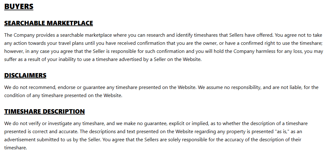 They claim to buy timeshares from users as a way to “stop fees” and then “advertise them” like a rental/resale service. Yet their site has no marketplace, no listings, and no evidence of any timeshare being resold.