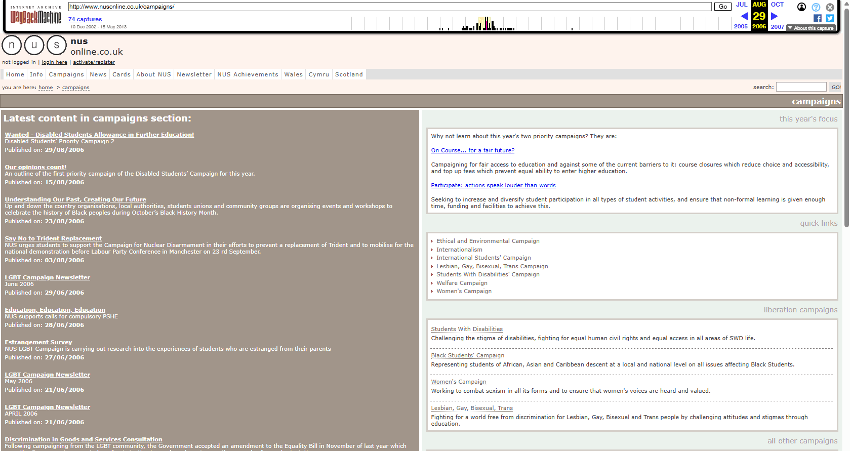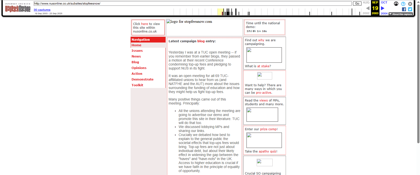 - Originally used in 2003 as a UK student blog (“nusonline.co.uk/subsites/stopfeesnow/”) according to the Wayback Machine. (Don’t visit it now—it redirects to something malicious.)