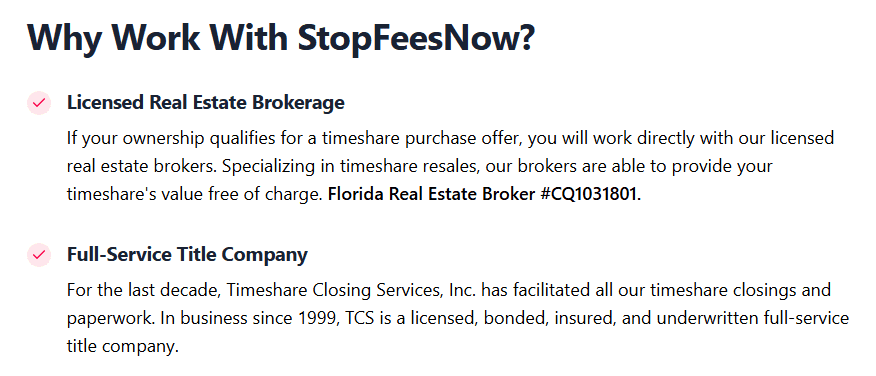 Additional Note: There's another website under the name "webuyandselltimeshares.com" that has the exact same look and layout as StopFeesNow with even the exact same information regarding Timeshare Closing Services, so it's best to avoid both entirely.