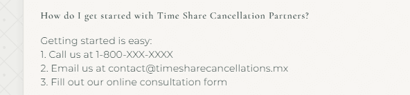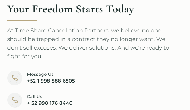 Time Share Cancellation Partners is a newly established (as of 2025) timeshare cancellation company, shrouded in ambiguity and raising several red flags. Despite operating with a ".mx" domain, their website is entirely in English with no Spanish version available, which is unusual for a domain targeting Mexico. Right from the start, they demand a steep 50% upfront fee, ranging from $1,500 to $7,000. This is particularly concerning when there are alternatives in the market that require no upfront payments at all.