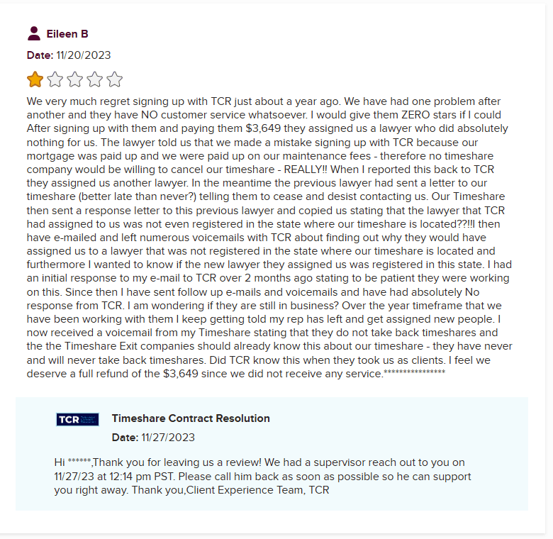 Even more telling, one glowing 5-star review outright says: “They used to be called Timeshare Compliance.” TCR’s official response? "We’d like to clarify that Timeshare Contract Resolution is a separate and distinct company and not affiliated with Timeshare Compliance.” Oh really? Are you sure about that?