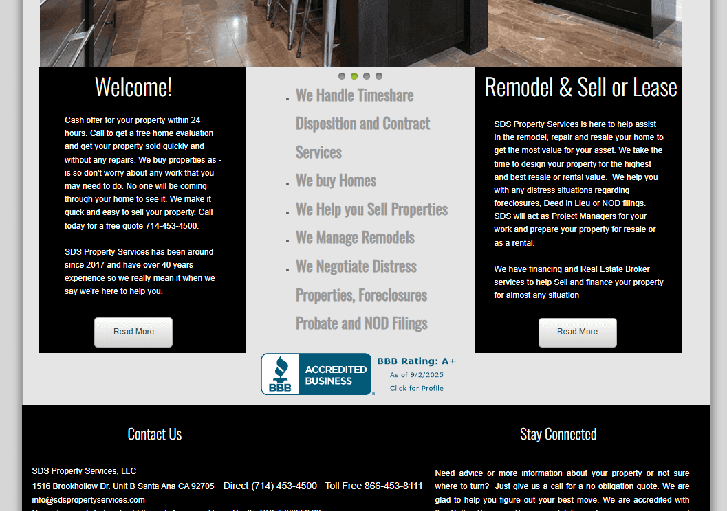 To their credit, the SDS Property Services main site (sdspropertyservices.com) is more straightforward. It directly references their timeshare cancellation services, even if the site itself is mostly focused on real estate remodeling and sales.