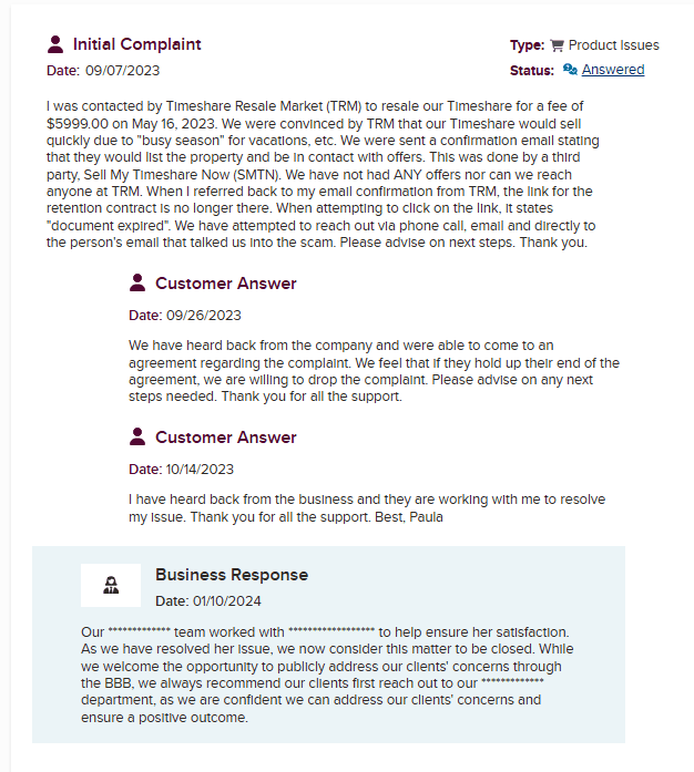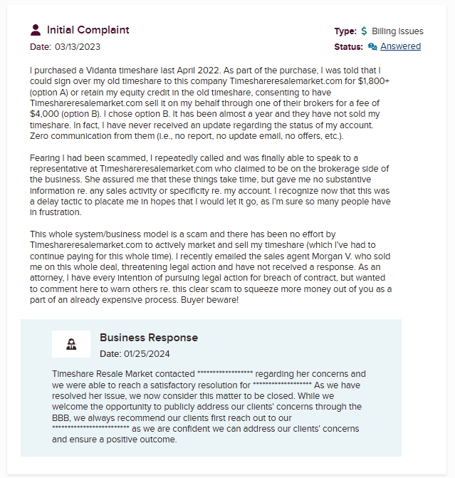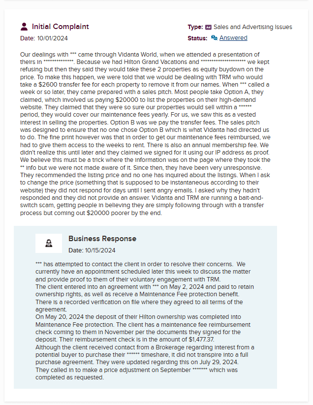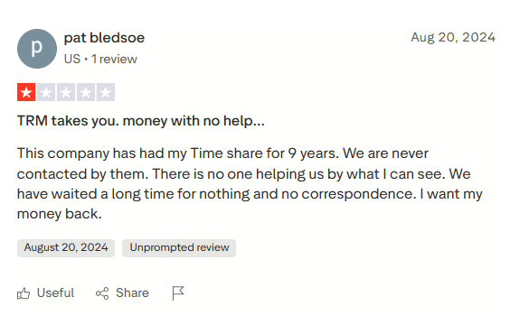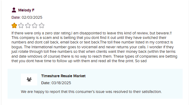 To be fair, TRM appears to resolve complaints on the BBB when they’re pushed to respond, and user satisfaction after resolutions is generally neutral. They don’t come across as outright fraudulent—just inconsistent, like most businesses operating in the resale space. That leaves us with a “proceed with caution” verdict. If someone is set on trying to sell their timeshare, TRM is no better or worse than similar platforms—but certainly not a reliable exit strategy.