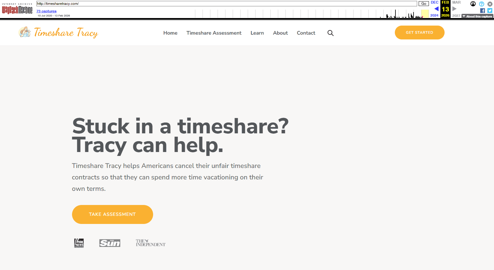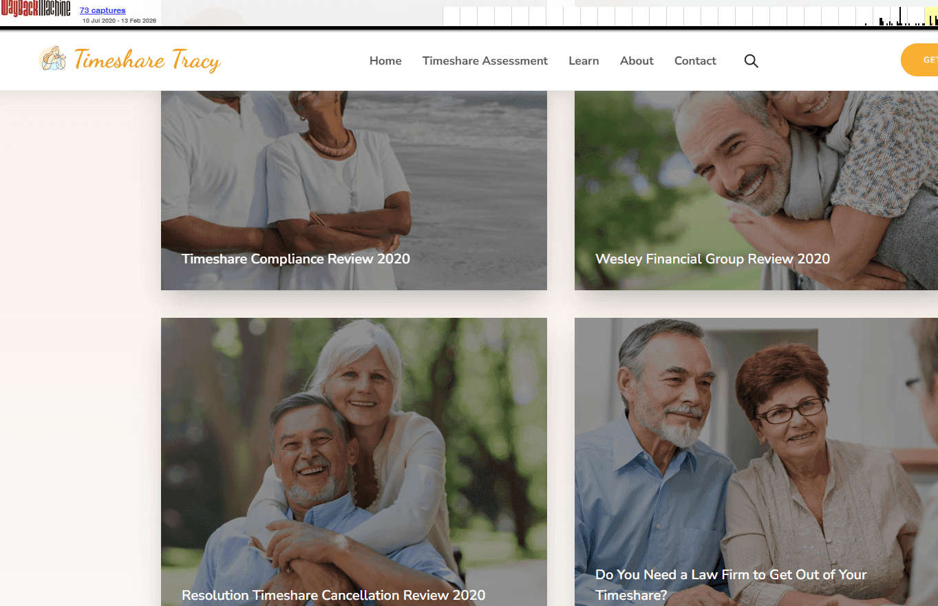 The last archived glimpse of the “old” Timeshare Tracy—with its original logos, blogs, and disclaimers—was captured on February 13th, 2026. Shortly afterward, the entire site transformed.