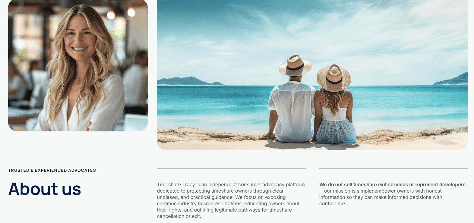 - A newly written About page saying “We do not sell timeshare exit services or represent developers,” which feels more like legal positioning than actual clarity.
