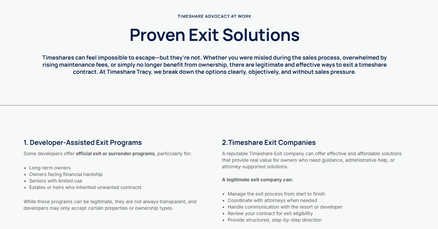 - Vague mentions of “Developer-Assisted Exit Programs,” “Attorney-Assisted Timeshare Exit,” and “Timeshare Exit Companies,” none of which include names, partners, attorneys, or any verifiable details.