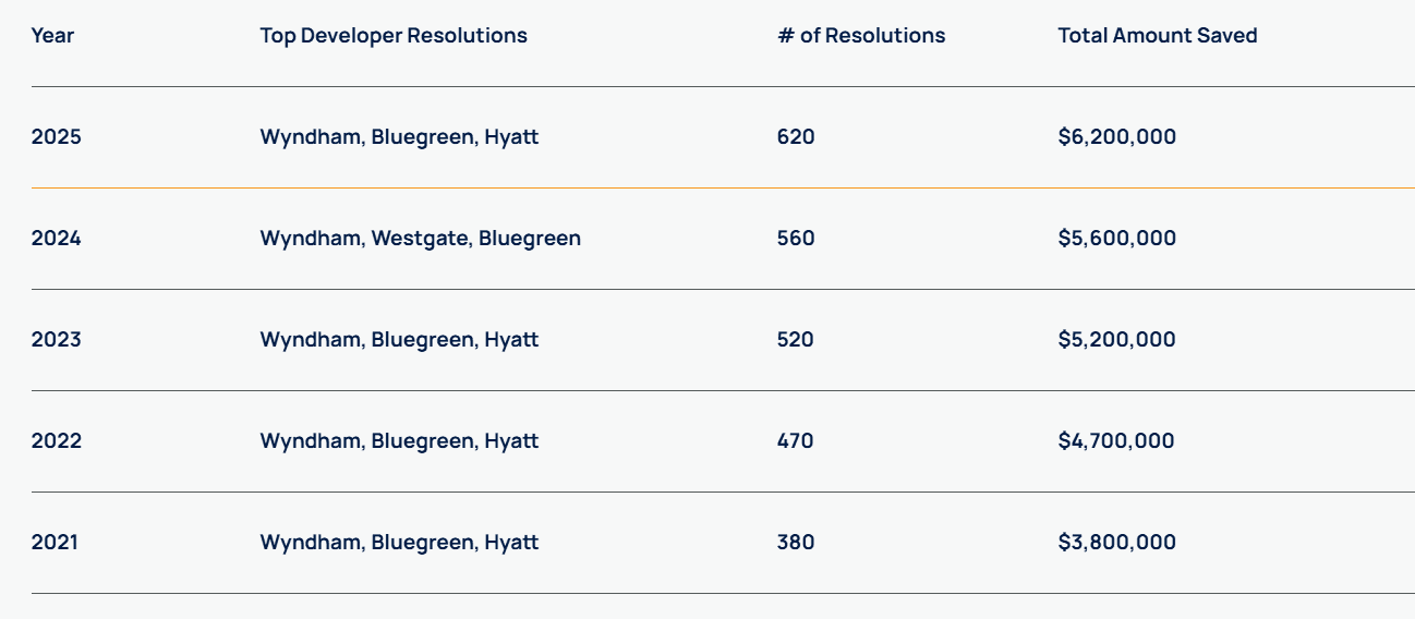 - Claims of completing a very large number of timeshare resolutions (numbers that feel, frankly, inflated).