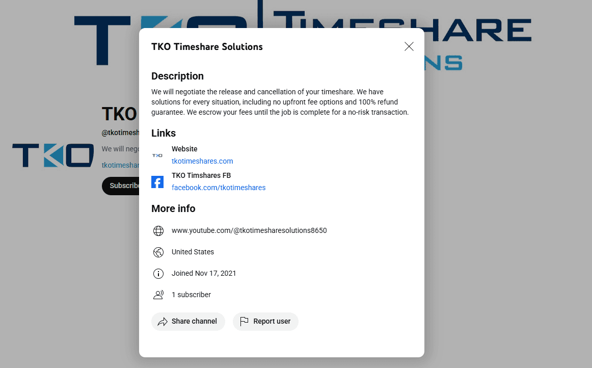 TKO Timeshare Solutions positions itself as a timeshare exit company, though its true origins and credibility are murky at best. While they claim to have been established in 2021, there are traces of their activity stretching further back. For instance, their YouTube channel dates to 2021 but contains no videos and a single lone subscriber. Their Facebook presence suggests even earlier ambitions, possibly as far back as 2018, when they marketed themselves as “timeshare relief” rather than “timeshare solutions.”